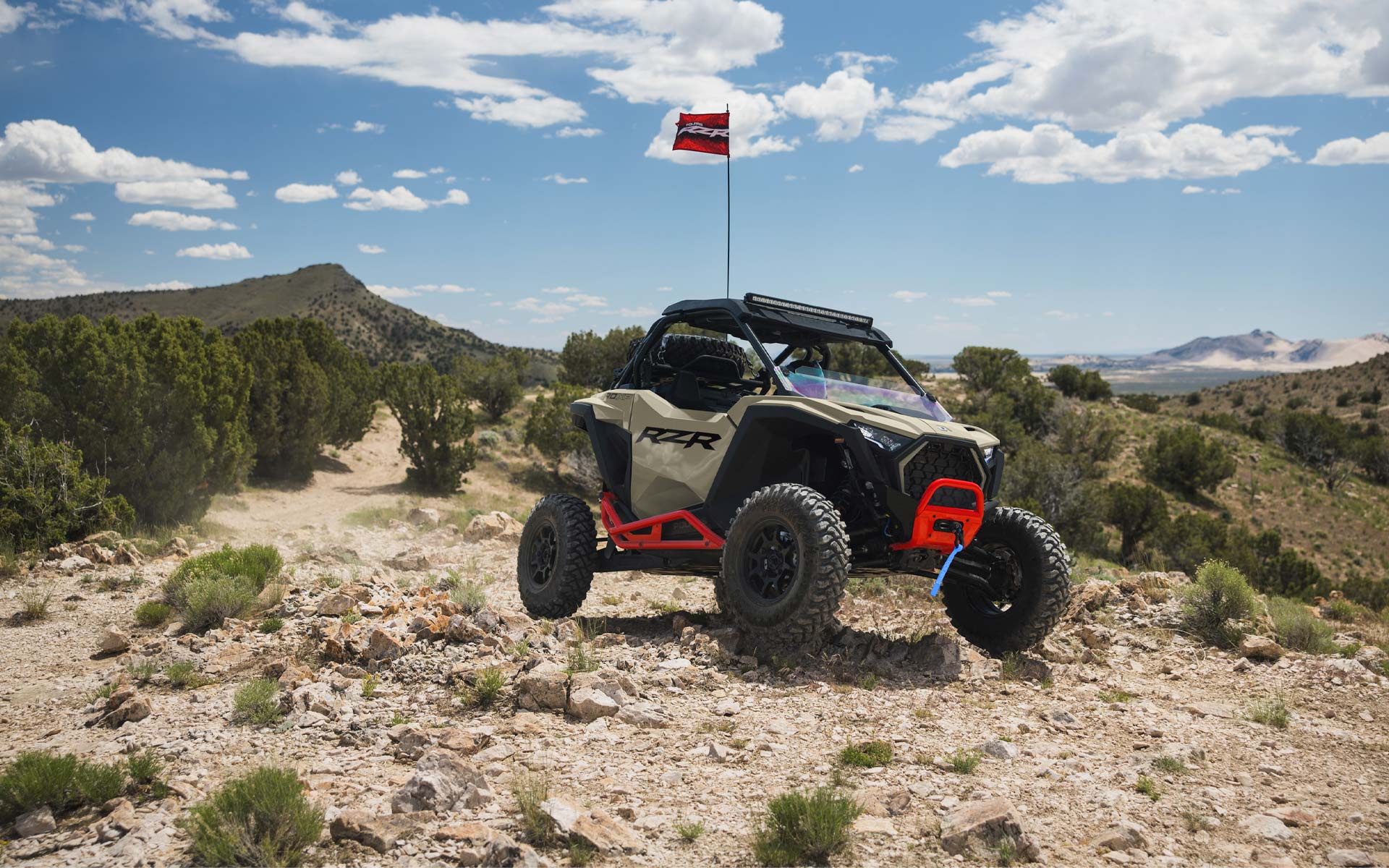 - Signature RZR Fang-Akzentbeleuchtung; weiße LED-Abblend- und Fernlichter sowie rote LED-Rück- und Bremslichter; animierte Innenraumbeleuchtung